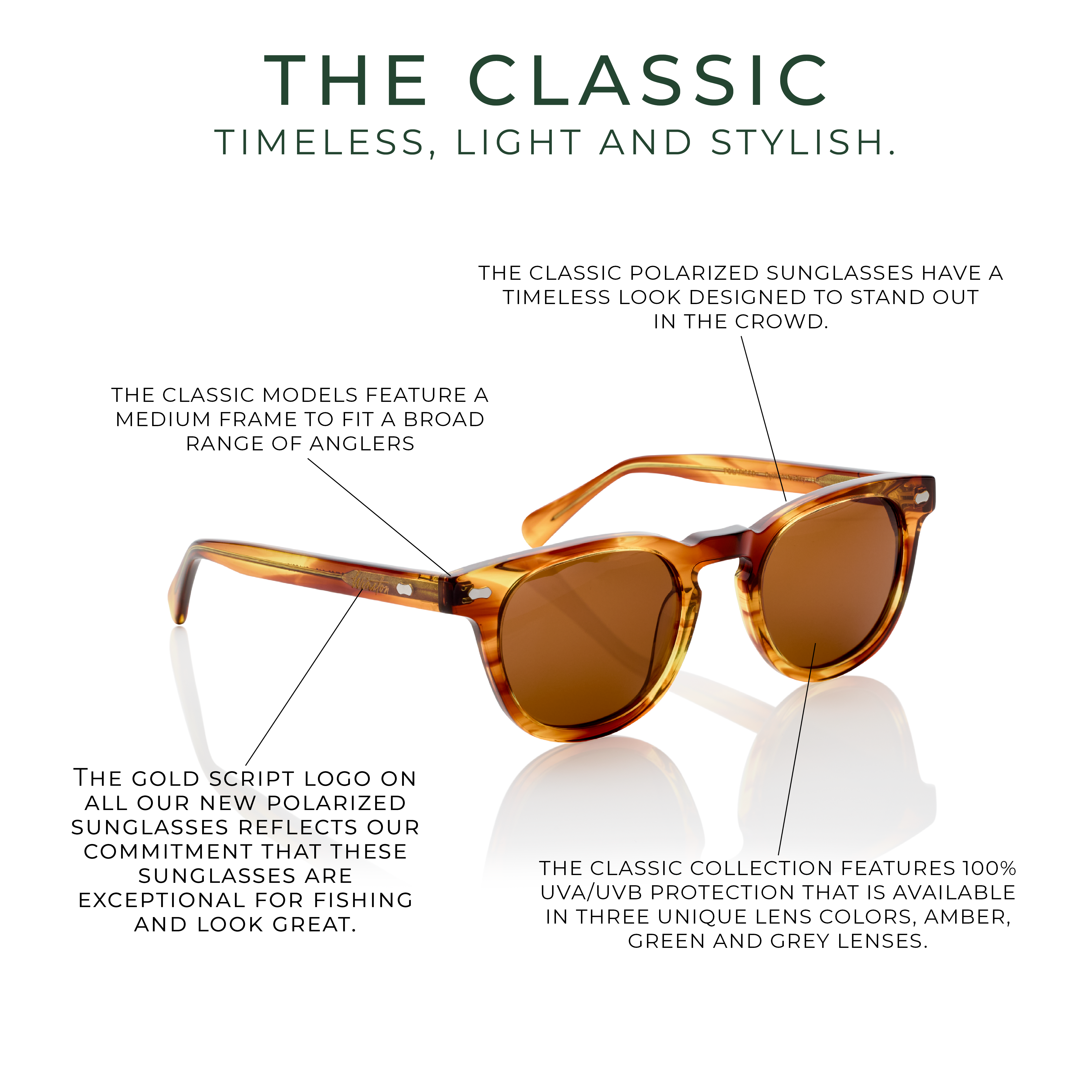 Our new Classic sunglasses capture a timeless aesthetic and feature polarized lenses with excellent clarity, allowing for all-day comfort while you are fishing or relaxing and want to look your best. Our Classic sunglasses use lightweight clear polarized triacetate cellulose (TAC) lenses with excellent optics to enhance your fishing experience. With a timeless look, our Classic sunglasses are designed to stand out in the crowd.